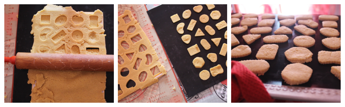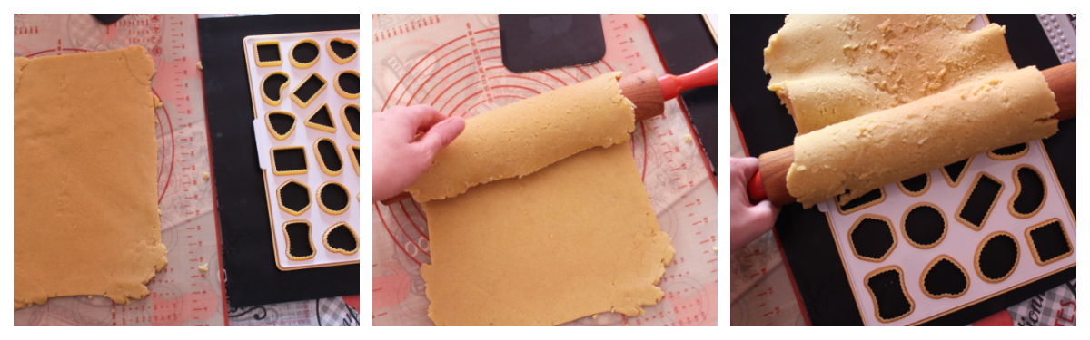 Passate il mattarello sull’impasto in modo che i biscotti si taglino e rimuovete lo stampo, il gioco è fatto! Procedete così fino a terminare la pasta. Cuocete i biscotti in forno già caldo a 180° per circa 10 minuti.