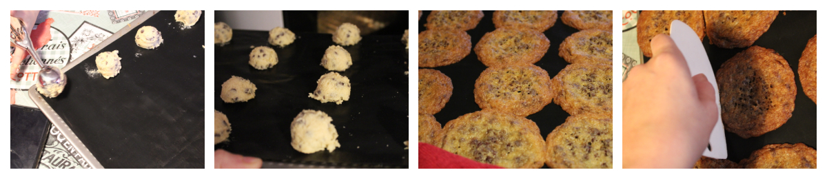 Foderate una placca con della carta forno, sopra dovrete sistemare delle palline d’impasto poco più grosse di una noce, ben distanziate. Per sbrigarmi io utilizzo un porzionatore da gelato da 3 cm e al posto della carta forno utilizzo un foglio riutilizzabile di teflon.