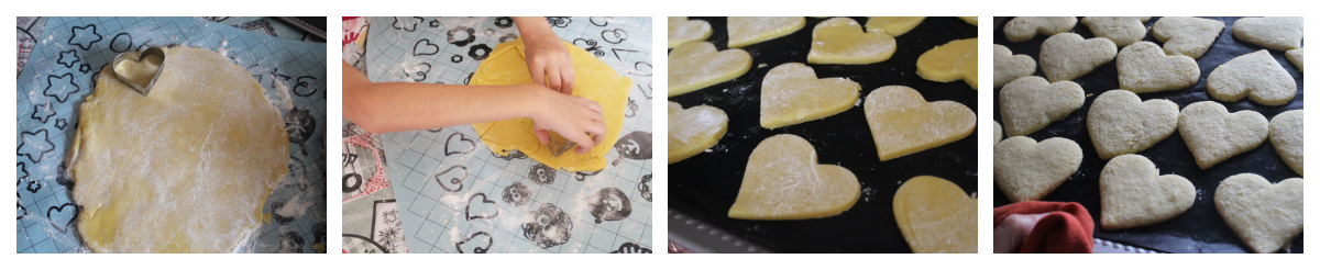 Stendete l’impasto in uno spessore di circa 1 cm e ritagliate i biscotti con un tagliapasta a forma di cuore; sistemateli sulla placca e cuocete per 10 minuti. Una volta pronti, lasciate raffreddare i biscotti sulla placca prima di staccarli.