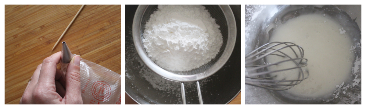 Preparate una tasca da pasticcere con bocchetta tonda liscia piccolissima. Setacciate lo zucchero a velo e unite il latte e la vaniglia; mescolate fino a sciogliere tutto lo zucchero con una frusta. Versate subito la glassa nella tasca da pasticcere.