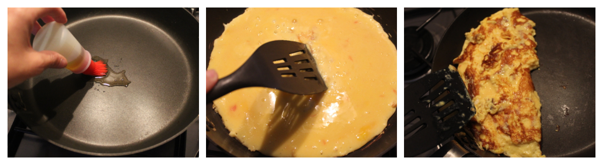 Scaldate una padella e ungetela leggermente, versate il composto di uova e fatelo rapprendere, rompetelo con una paletta per farlo cuocere uniformemente. Quando la frittata comincerà a essere cotta anche in superficie, con una paletta piegatela a metà e proseguite la cottura ancora per 1 minuti per lato.