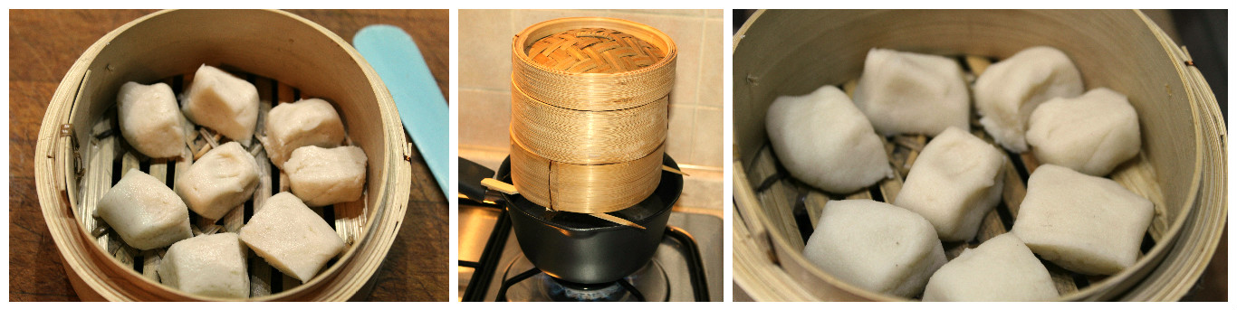 Dividetela in 16 pezzetti circa e trasferiteli in una vaporiera. Io ne ho approfittato per utilizzare la mia in bambù! Cuocete per 20 minuti, devono perdere l’aspetto traslucido.
