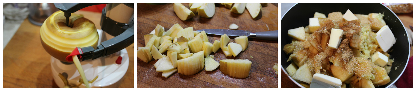 Sbucciate le mele, eliminate il torsolo e riducetele a pezzettini, conditele con lo zucchero di canna, la cannella e la vaniglia e ancora zenzero grattugiato a vostro piacere, direttamente in un tegame a bordi alti. Aggiungete il burro e fate cuocere a fiamma vivace per 10 minuti, mescolando delicatamente, tenete da parte.