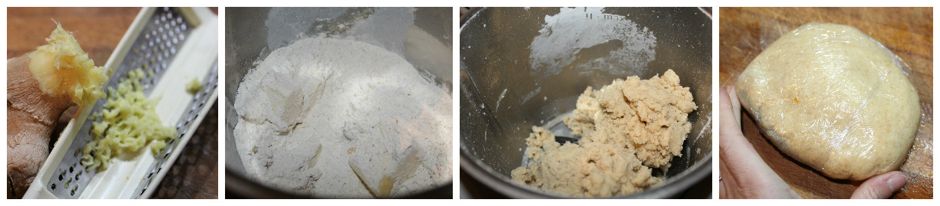 Grattuggiate lo zenzero senza la buccia nel robot da cucina e unite tutti gli altri ingredienti, azionatelo alla massima velocità e lavorate finchè da un composto di briciole si trasformerà in un composto omogeno, raccoglietelo con le mani, fate un panetto e avvolgetelo in pellicola trasparente. Fatelo riposare in frigorifero per una mezz’ora abbondante.