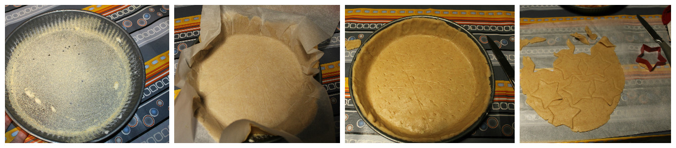 Il più grosso sarà la base della vostra crostata, trasferitelo nella teglia aiutandovi con la carta forno. Adattatelo alla teglia e bucherellate il fondo con una forchetta.