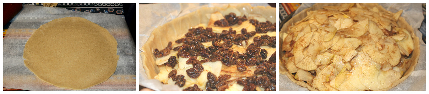 Distribuita metà delle mele condite, all’interno della tortiera in uno strato uniforme, sopra versateci l’uvetta e concludete con le restanti mele creando una vera montagna leggermente più alta al centro.