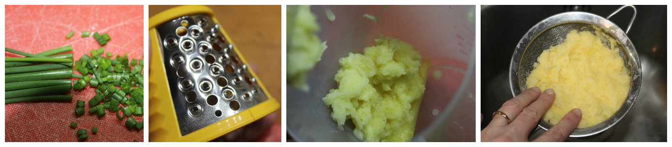 Potete utilizzare una grattugia a mano oppure una più comoda elettrica, come nel mio caso. Grattugiate quindi le patate, trasferite la polpa ottenuta in un colino e strizzatela premendo con le mani per rimuovere l’acqua in eccesso.