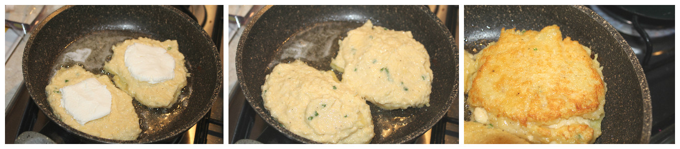 Sistematelo al centro dei draniki e ricoprite ognuno con la restante pastella, cuocete per circa 4 minuti per lato, se serve rivoltate le frittelle anche pià volte per evitare che si brucino.