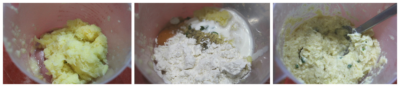 Aggiungete tutti gli ingredienti tranne il caprino e mescolate a formare una densa pastella. Se risultasse troppo liquida aggiungete un pochino di farina, se troppo densa un goccio di yogurt. La consistenza deve essere leggermente più densa di un impasto per torte, ma ancora gestibile a cucchiaio.