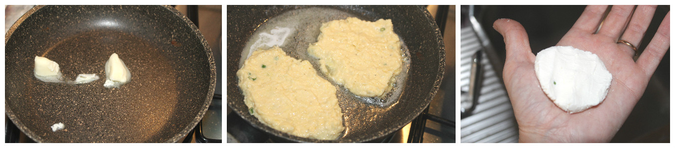 Sciogliete il burro in un pentolino antiaderente, con il cucchiaio versate il composto formando la base dei draniki, non serve essere precisi, appiattite il composto con il dorso del cucchiaio. Dividete il caprino a metà e appiattitelo nel palmo della mano.