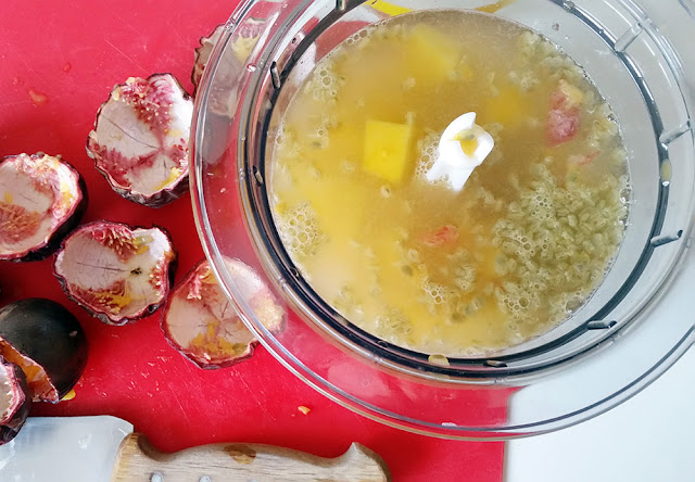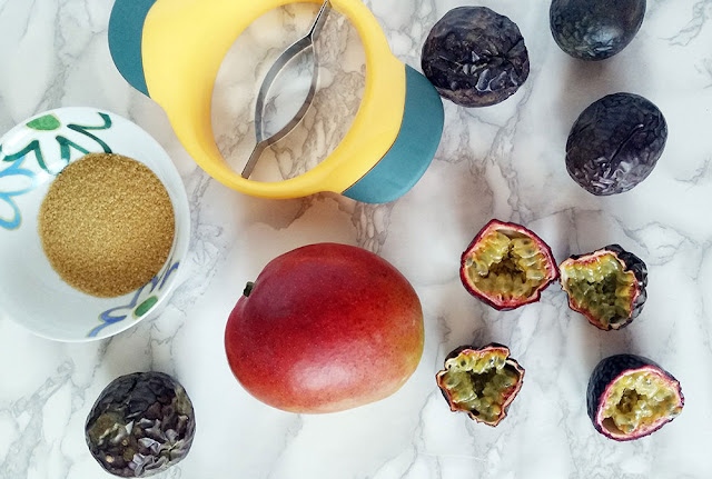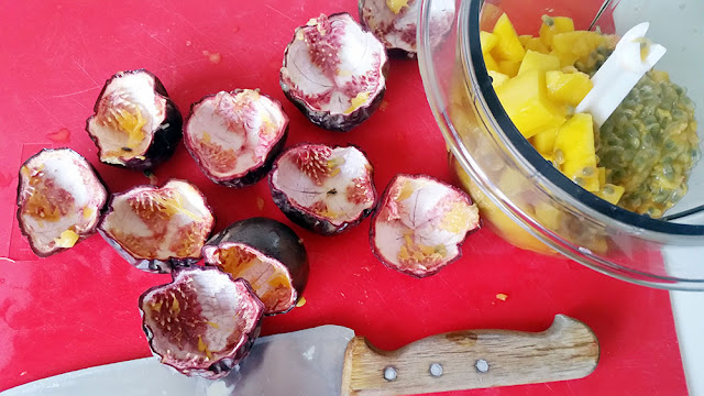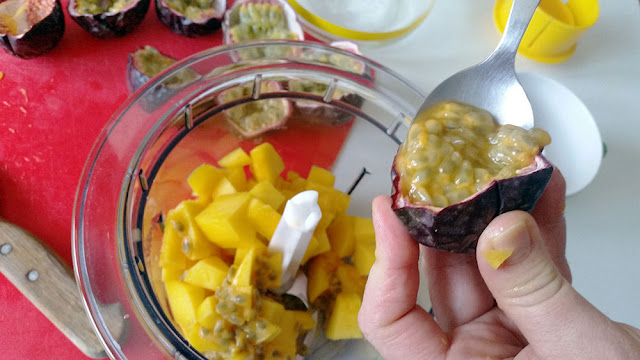 Peel and cube the mango. Half the passion fruits and scoop out the flesh. Place the fruits into a liquidizer or juicer or blender.