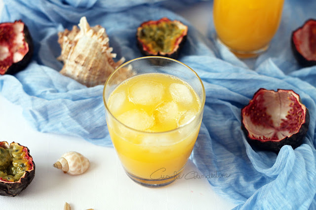 El sabor es delicioso: el dulce del mango maduro encaja perfectamente con el sabor ligeramente acido de la fruta de la pasión. ¿Y el color? Es un concentrado de oro puro, el sol del verano. De invitación no es así?