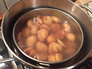 metterli in un setaccio di acciaio (ma va bene anche l’apposito cestello, che a me si è rotto) e lessarli per 15 minuti circa senza mai raggiungere un bollore vivace, che potrebbe rompere i frutti.