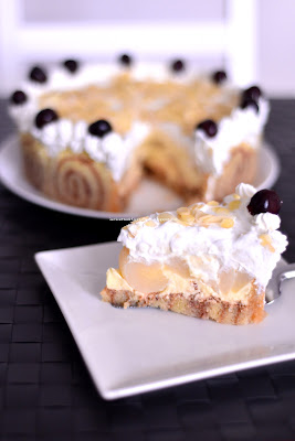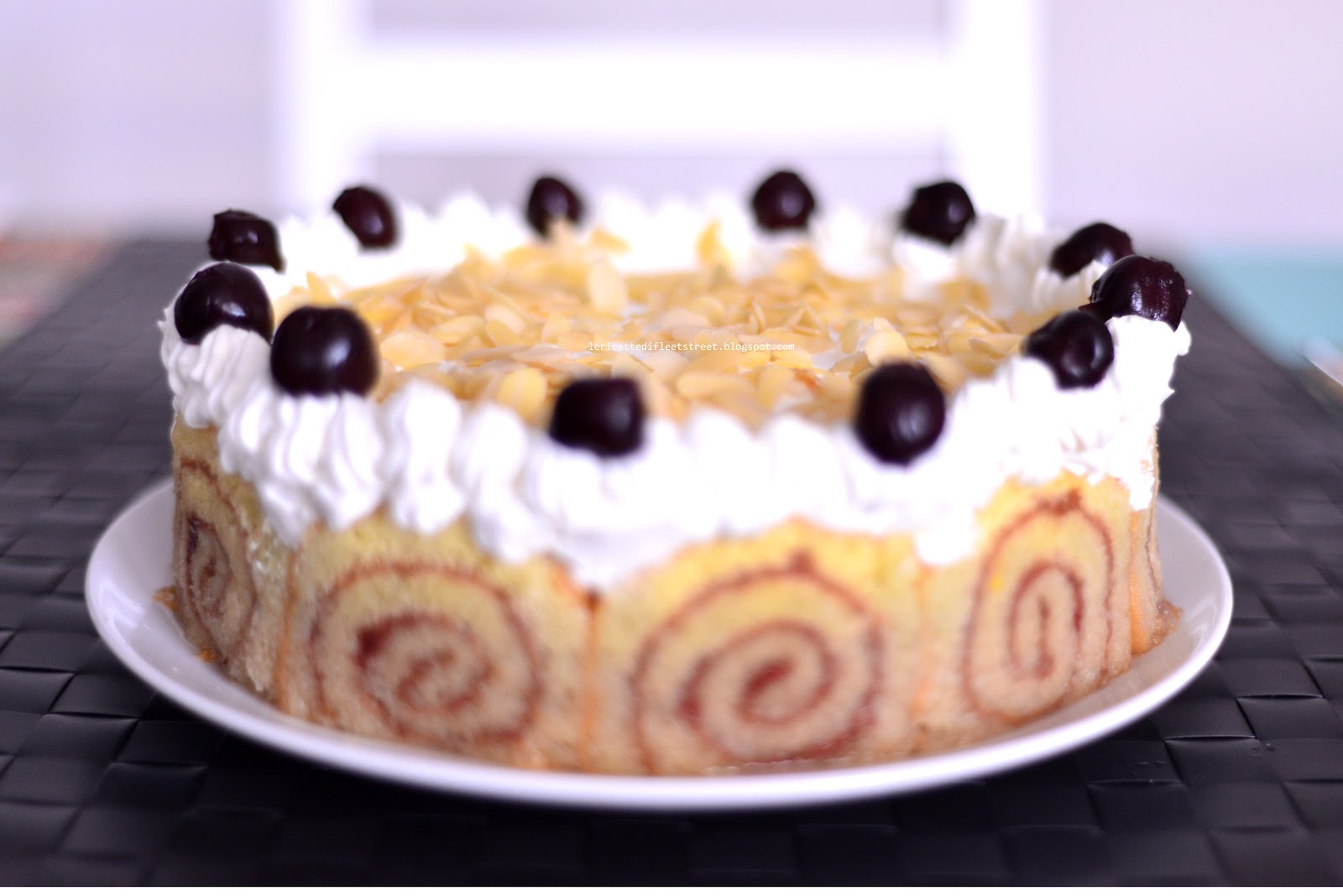 Montate la panna ed usatela per ricoprire la torta (ben raffreddata). Con la panna avanzata decorate il bordo. completate con le amarene sciroppate (asciugatele bene prima di disporle).