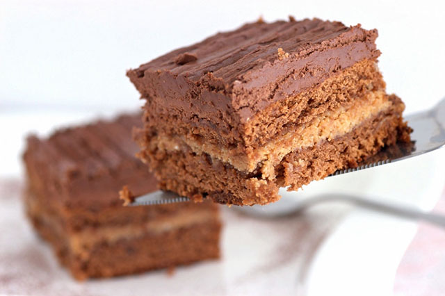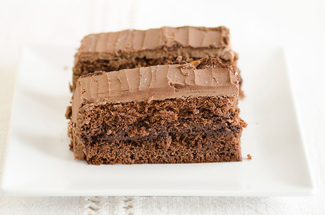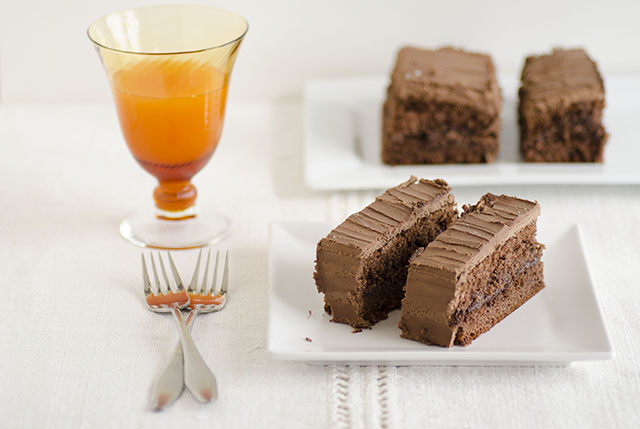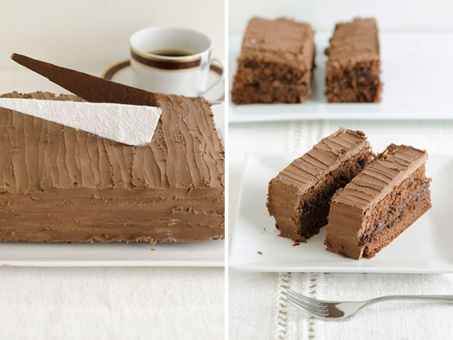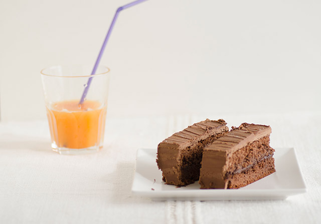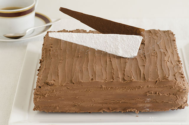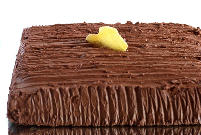Una base per torte con cioccolato e marzapane, una mousse di cioccolato all’interno e un denso e cremoso rivestimento di cioccolato.