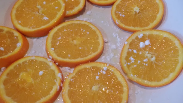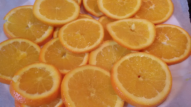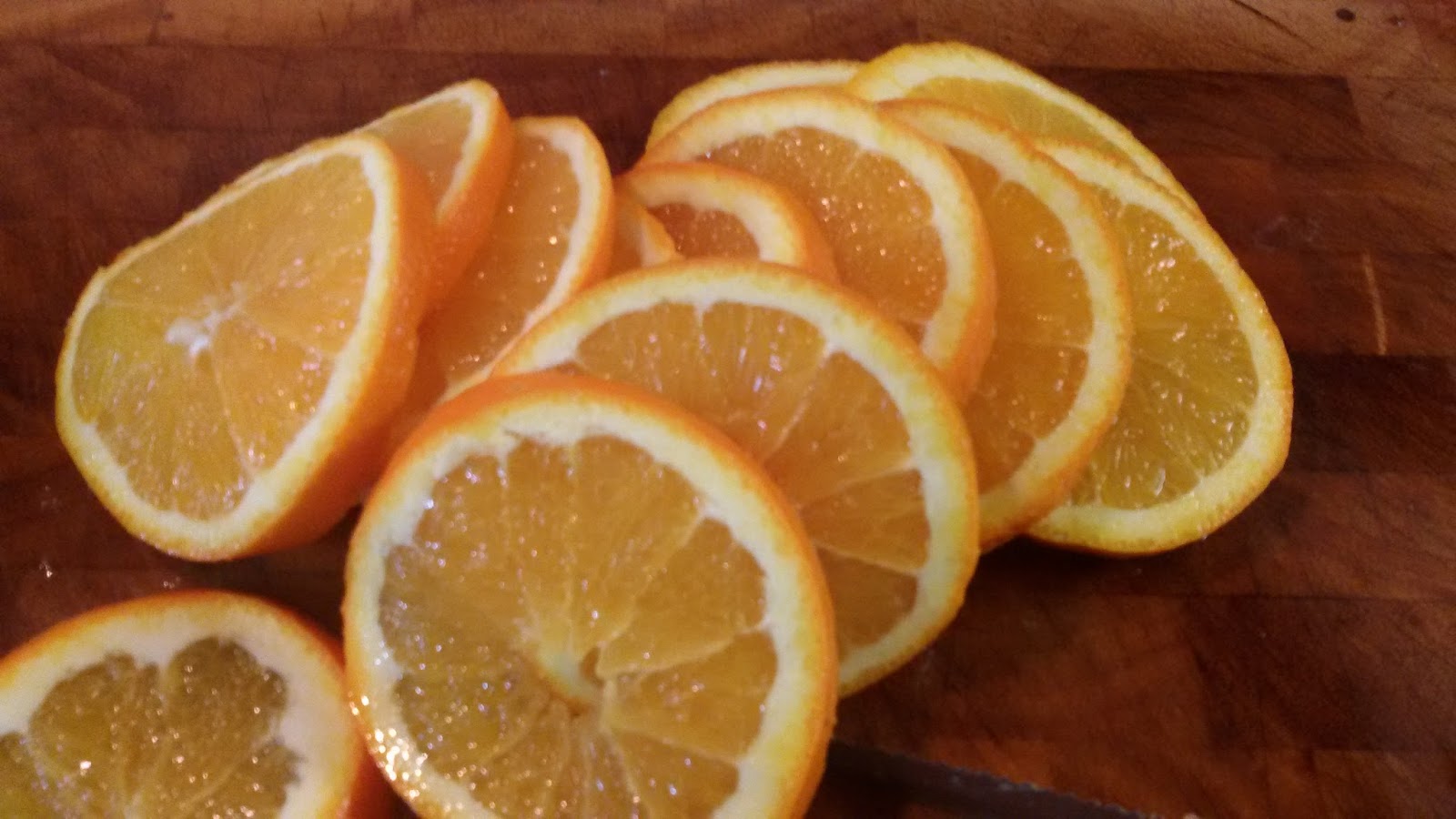 Lavate bene le vostre arance (meglio se non trattate ma io sono costretta a comprarle al supermercato) e affettatele cercando di fare fette tutte uguali e alte circa mezzo centimetro.