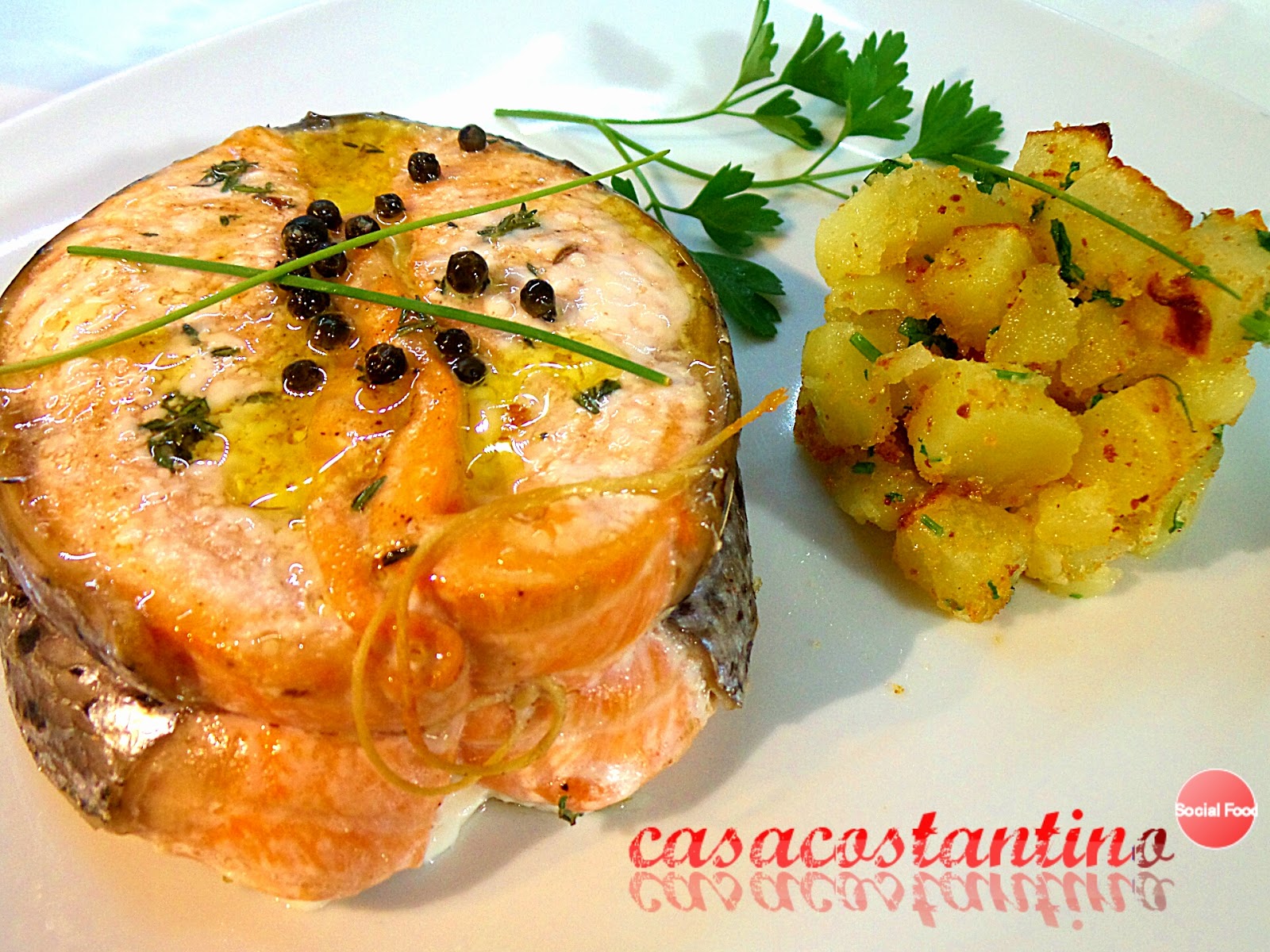 Adagiamo il medaglione sul piatto leggermente spostato su di un lato, aggiungiamo un filo d’olio a crudo e decoriamo con un paio di fili d’erba cipollina. Possiamo accompagnare il salmone con delle patate tagliate a cubetti piccoli e cotte in forno a 250° per 20′, spolverate di pangrattato, sale e pepe ed a cottura ultimata con del prezzemolo fresco appena tritato, mescoliamo e coppiamo a fianco del medaglione. Completiamo il piatto con un rametto di prezzemolo fresco per guarnire.