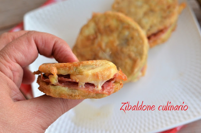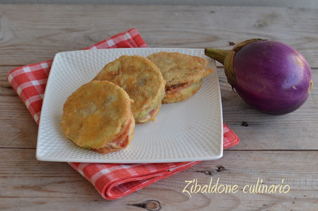 Farcire le fette di melanzana con scamorza e fettina di salame, passare poi nella farina e infine nell’uovo sbattuto.