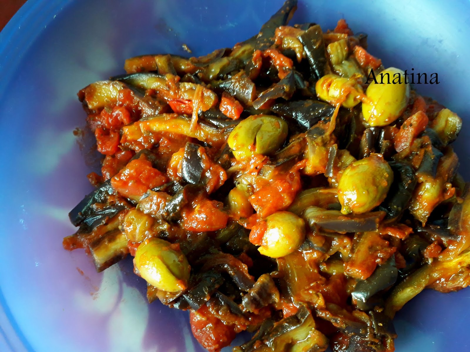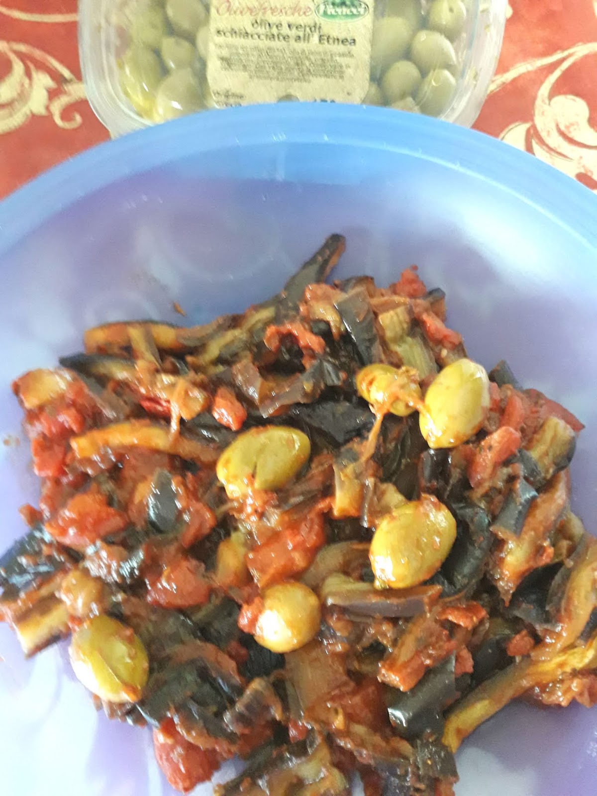 Bastera’ unire in una padella alta,melanzane,pomodori,aglio intero,capperi,olive denocciolate
