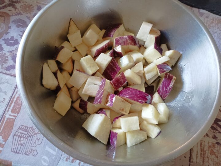 Tagliare le melanzane a cubetti, versarle in una ciotola, aggiungere un paio di cucchiai di olio extravergine d’oliva e un pizzico di sale.