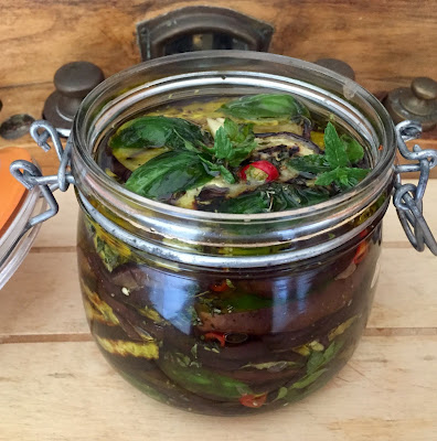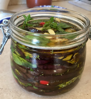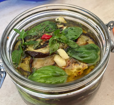 Sul fondo del barattolo versate un pò d’olio e sistemate le fette di melanzane alternandole con le foglie di basilico e di menta, l’aglio, il peperoncino e ancora origano. Con l’aiuto del pressino pressate bene le melanzane per non lasciare bolle d’aria e coprite con abbondante olio evo.