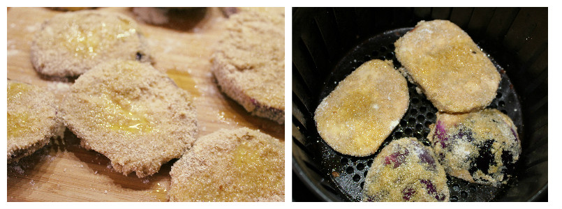 Con un’oliera spray o un pennello ungete con qualche goccia d’olio entrambi i lati delle fette impanate, poi inseritene quante più ce ne stanno nel cestello e cuocete per 8 minuti a 200°, poi rivoltate le fette e cuocete ancora per 3 minuti.