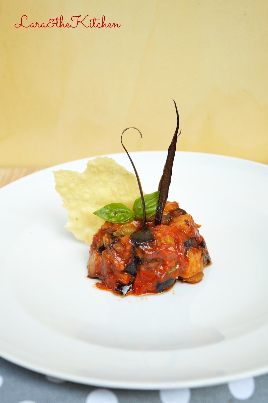 Giunti al momento di servire, scaravoltate la formina al centro del piatto e decorate con qualche fogliolina di basilico, delle striscioline di buccia di melanzana fritta e una piccola cialda di pane guttiau.