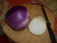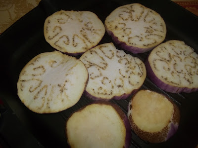 Lavate, asciugate e tagliate a fette una melanzana tonda; disponetele su una teglia e fatele rosolare solo con l’aggiunta di sale.