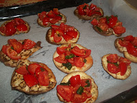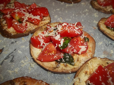 A questo punto iniziate a preparare le bruschette: adagiate su ognuna una fetta di melanzana grigliata, un cucchiaio di pomodorini ed una grattata di formaggio.
