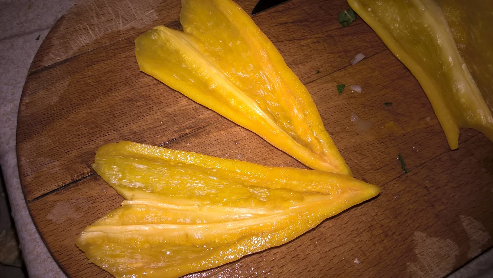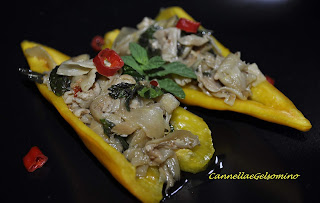 Si possono servire su crostini di pane tostato, se si vuole, ma io le ho voluto presentare in versione finger food, realizzando con delle falde di peperone giallo delle barchette, sulle quali adagiare una cucchiaiata di melanzane.