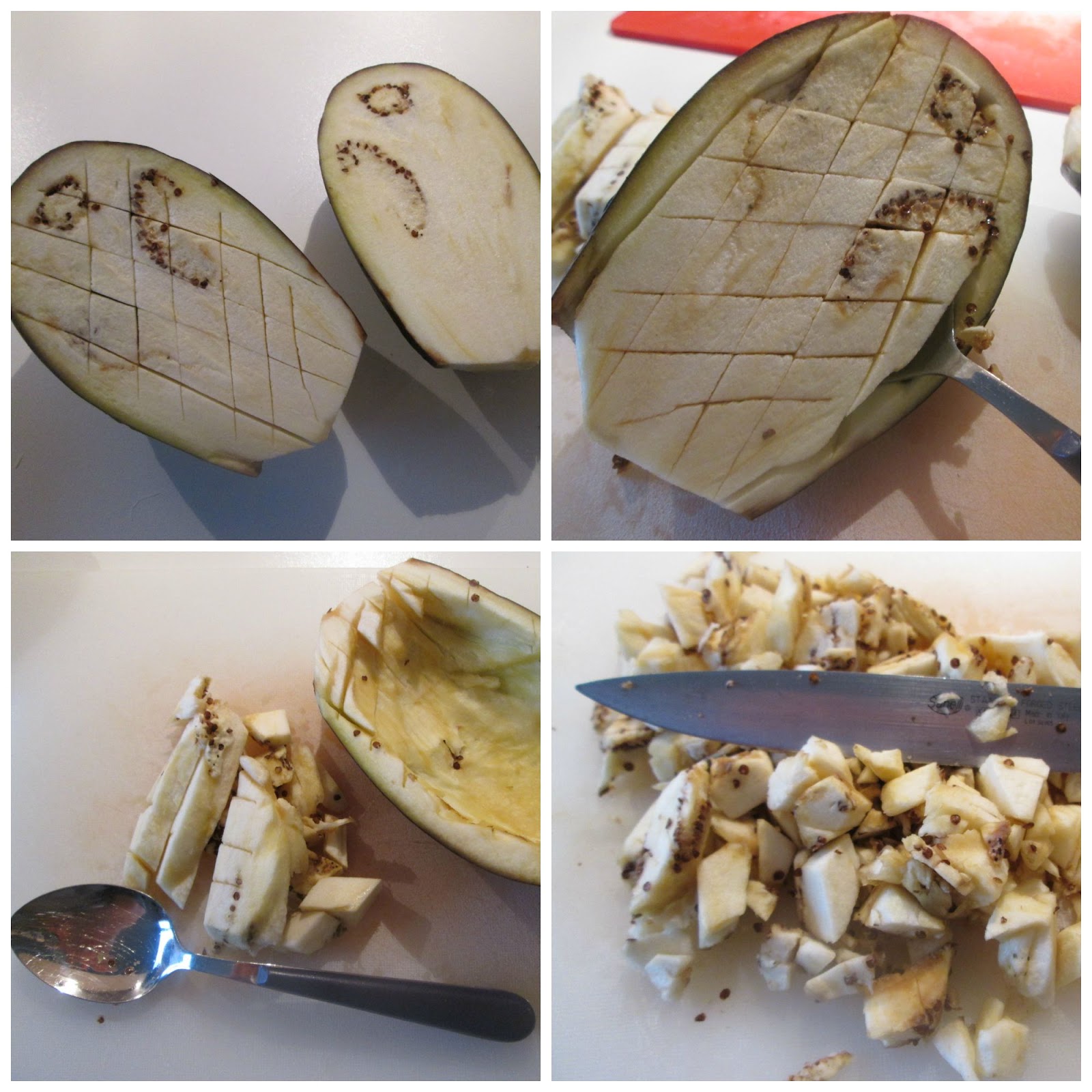 - lavate le melanzane, tagliatela a metà e incidete la polpa, ad un centimetro dalla buccia, con la lama di un coltello e con l’aiuto di un cucchiaio asportate l’interno e riducetelo a cubettini