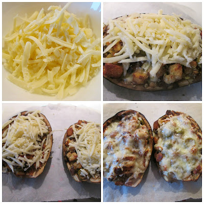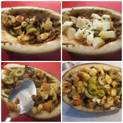 - farcite ora l’interno delle vostre melanzane alternando al composto di pane/melanzane e olive i cubetti di caciocavallo (schiacciate per bene, con l’aiuto di un cucchiaio la farcitura delle vostre melanzane)