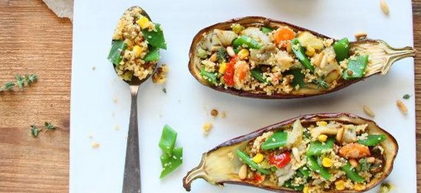 A questo punto mettete il cous cous in una ciotola con una tazza d’acqua bollente, poi – dopo averlo fatto riposare per venti minuti – aggiungete il sale, il pepe, l’aglio e i pomodorini. Infine riempite ogni conchiglia di melanzana con il composto amalgamato in precedenza e cuocete per mezz’ora.