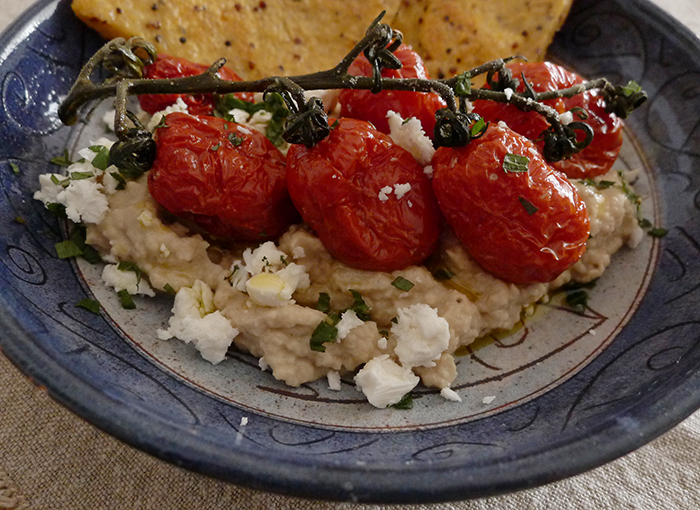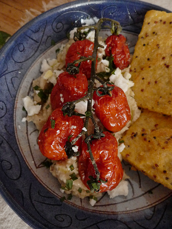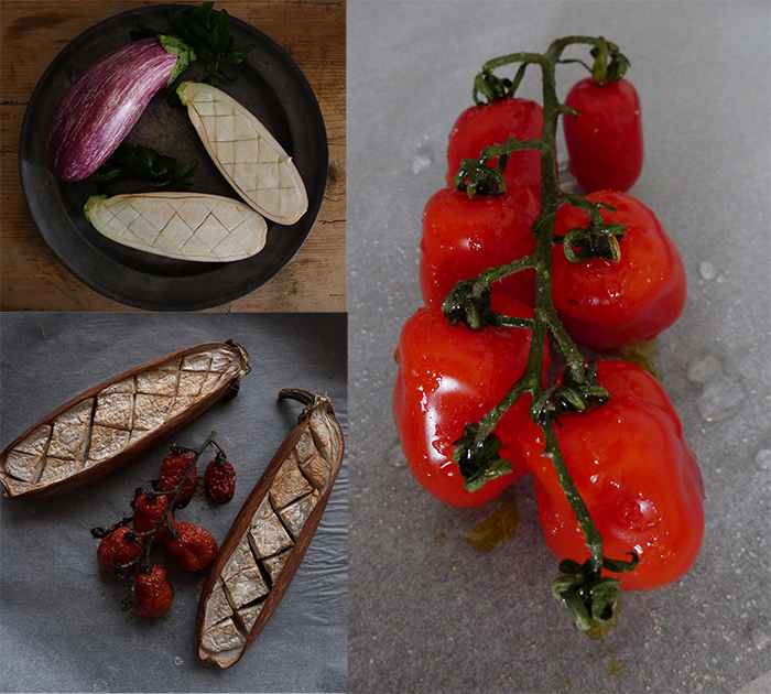 Mettete la melanzana in forno e con lei i pomodorini appena cosparsi di sale e un filo d’olio, lasciate cuocere a 160° per un’oretta finche la polpa della melanzana sarà morbida e i pomodorini ben arrostiti.
