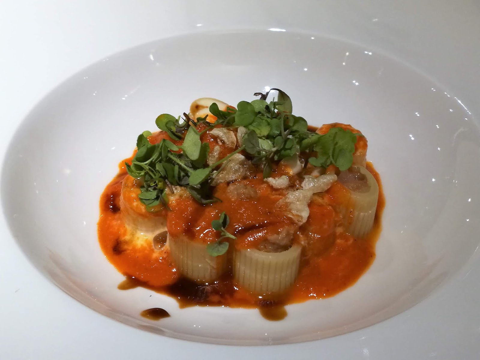 Tubettoni di pasta in farcia di maialino pugliese e gambero rosso, spuma di pecorino