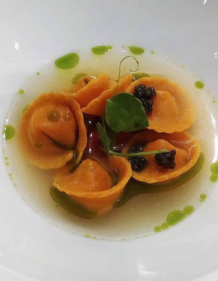 Tortelli di pomodoro, ventresca di tonno, caviale e acqua di pomodoro
