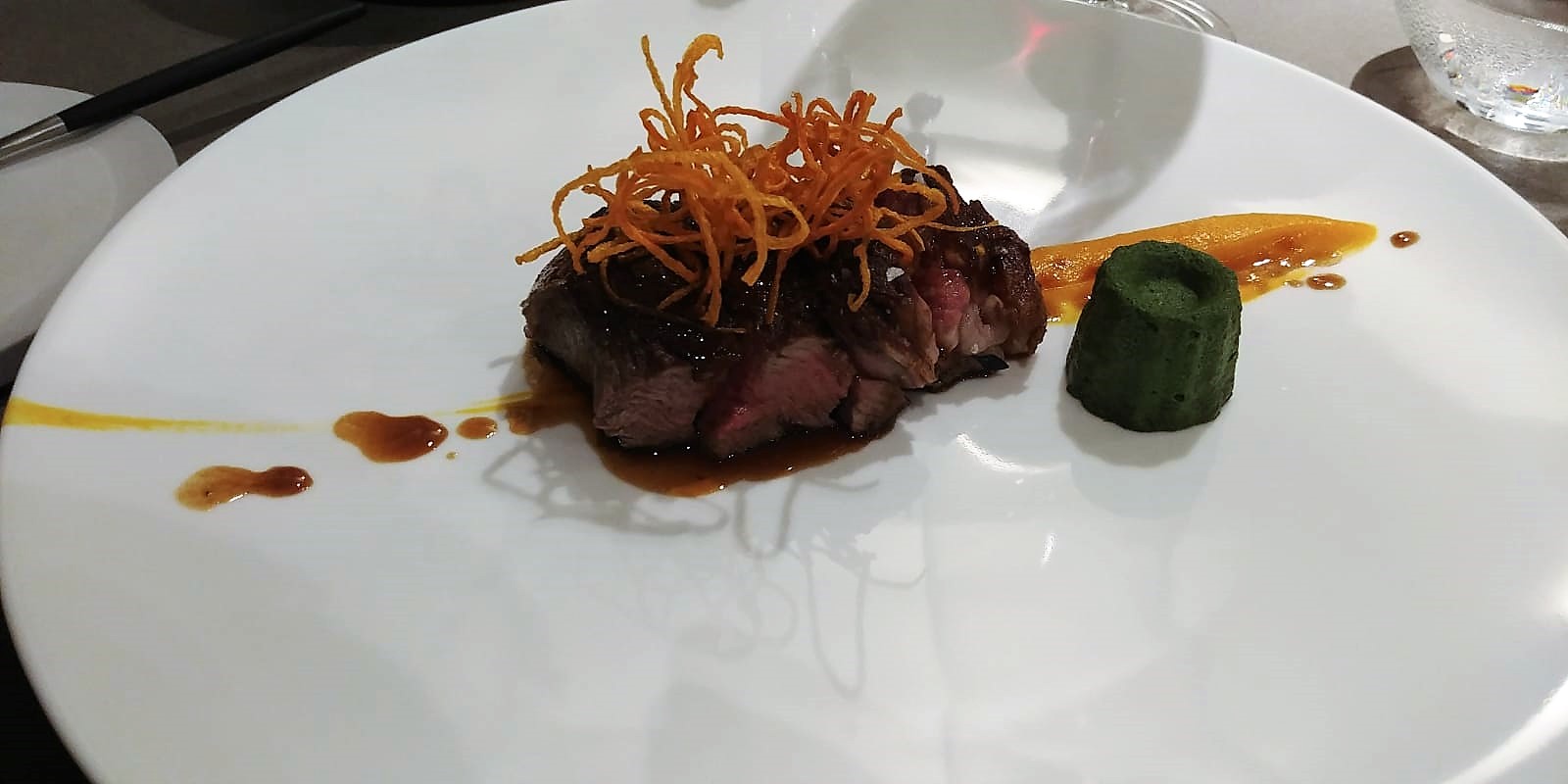 Tagliata di Manzo Jersey (vacca vecchia lucana), flan di spinaci, crema di carote e zenzero