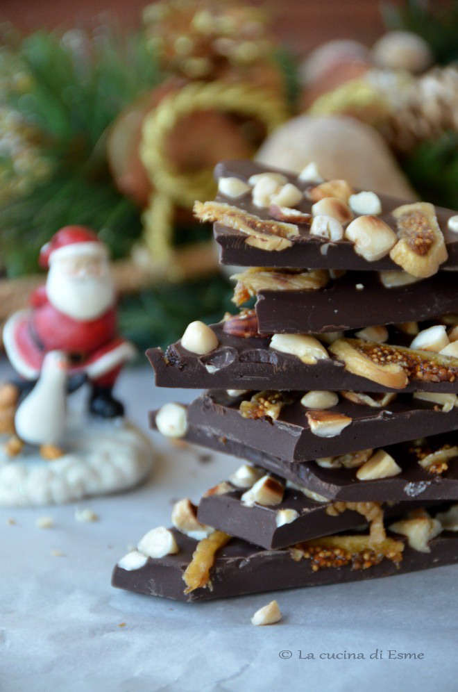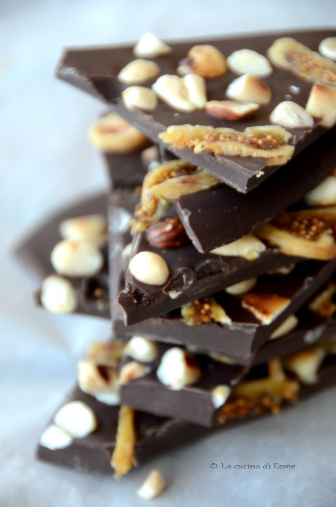 Fate sciogliere a bagno maria 250 gr di cioccolato fondente, quando sarà completamente fuso, lasciatelo riposare 5 minuti e poi versatelo su una teglia rivestita con carta forno, spalmatelo in un cerchio di circa 25/30 cm di diametro, poi disponeteci sopra i fichi secchi tagliati a fettine sottili, le nocciole e le mandorle tostate a secco in padella antiaderente e poi ridotte a pezzetti irregolari. Io ho usato il coltello per non distruggerla. Una volta posizionata tutta la frutta secca sulla cioccolata, lasciate riposare in un posto fresco (non in frigo) fino a quando il cioccolato si sarà del tutto rappreso. Infine tagliate a pezzi irregolari e conservate in una scatola di vetro ben chiusa a temperatura ambiente, oppure fatene dei sacchetti da regalare, oppure semplicemente godete di questa delizia!