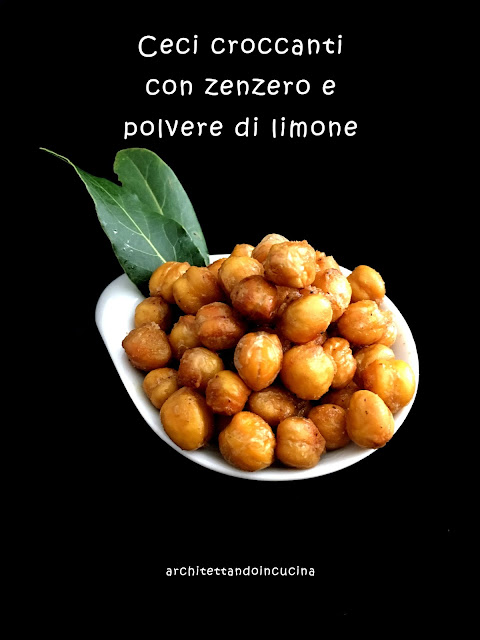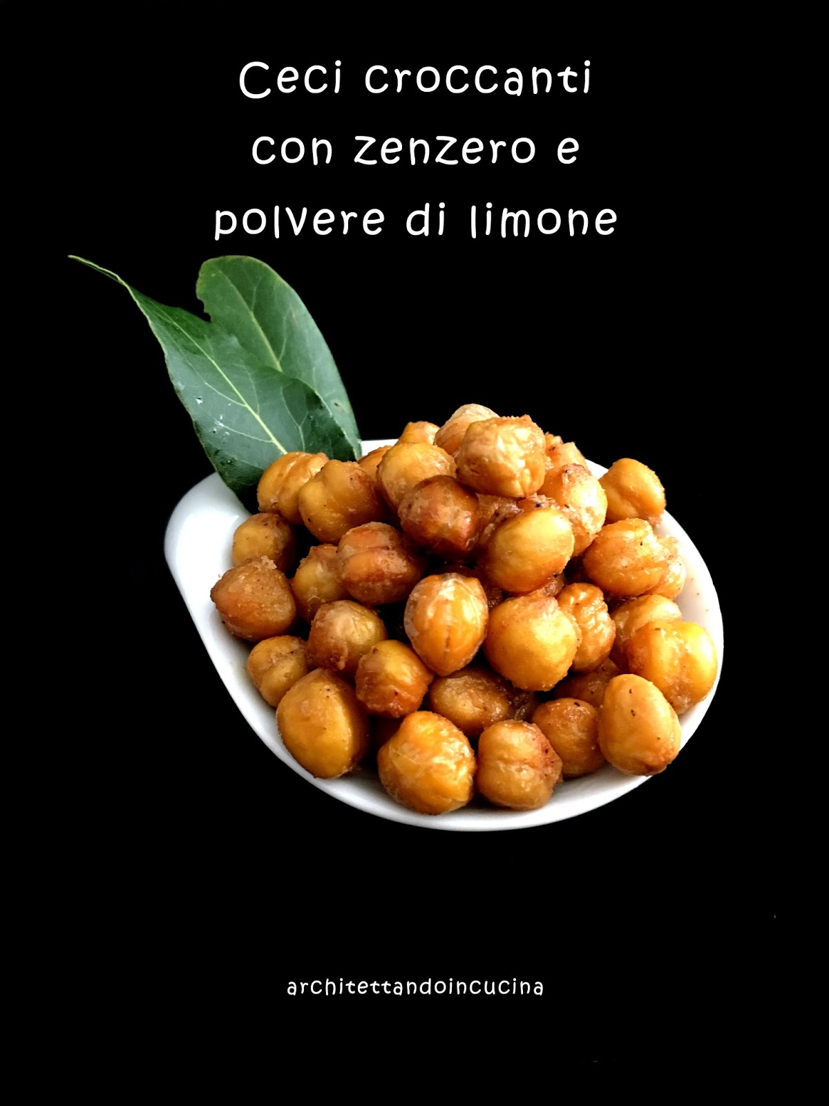 Scolare i ceci dall’acqua di cottura e farli asciugare su carta da cucina. Condirli con un filo d’olio extra vergine di oliva, zenzero, sale e pepe. Spolverarli di farina, mescolarli bene ed infornarli a 200° per circa 30 minuti. Toglierli dal forno, spolverarli di polvere di limone, farli raffreddare e servirli.
