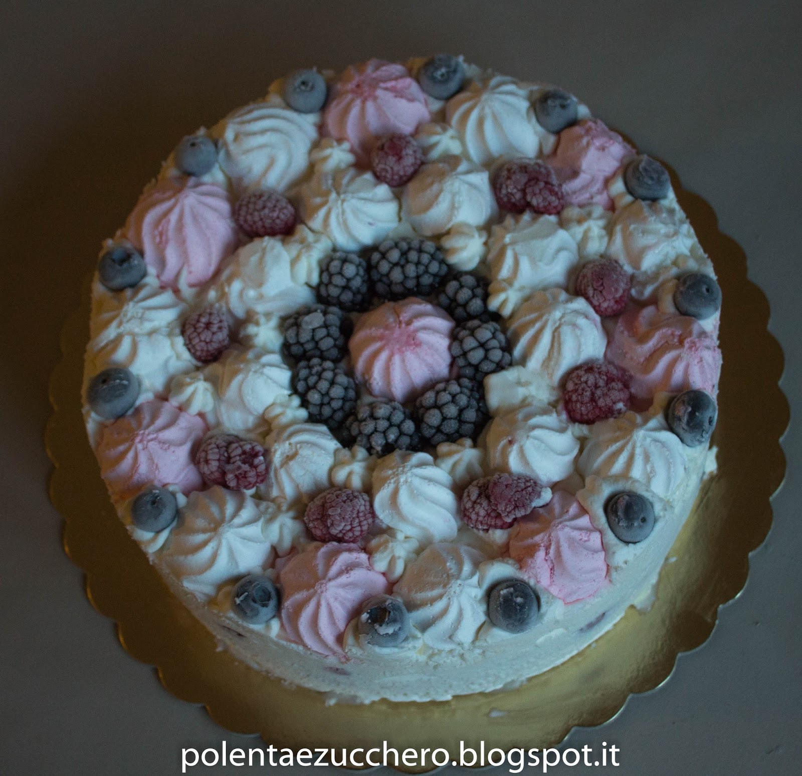 - Distribuire sulla superficie un leggero strato della panna messa da parte e disporvi sopra le piccole meringhe. Decorare con alcuni frutti e con dei ciuffi di panna e completare spatolando la panna rimasta sulla circonferenza del dolce.