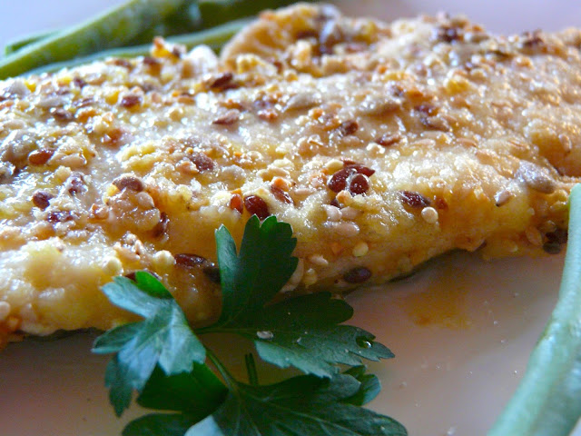 Versiamo la miscela di farine e semi con il prezzemolo sminuzzato in un altro piatto e vi adagiamo sopra i filetti di merluzzo, facendo aderire bene da entrambi i lati.