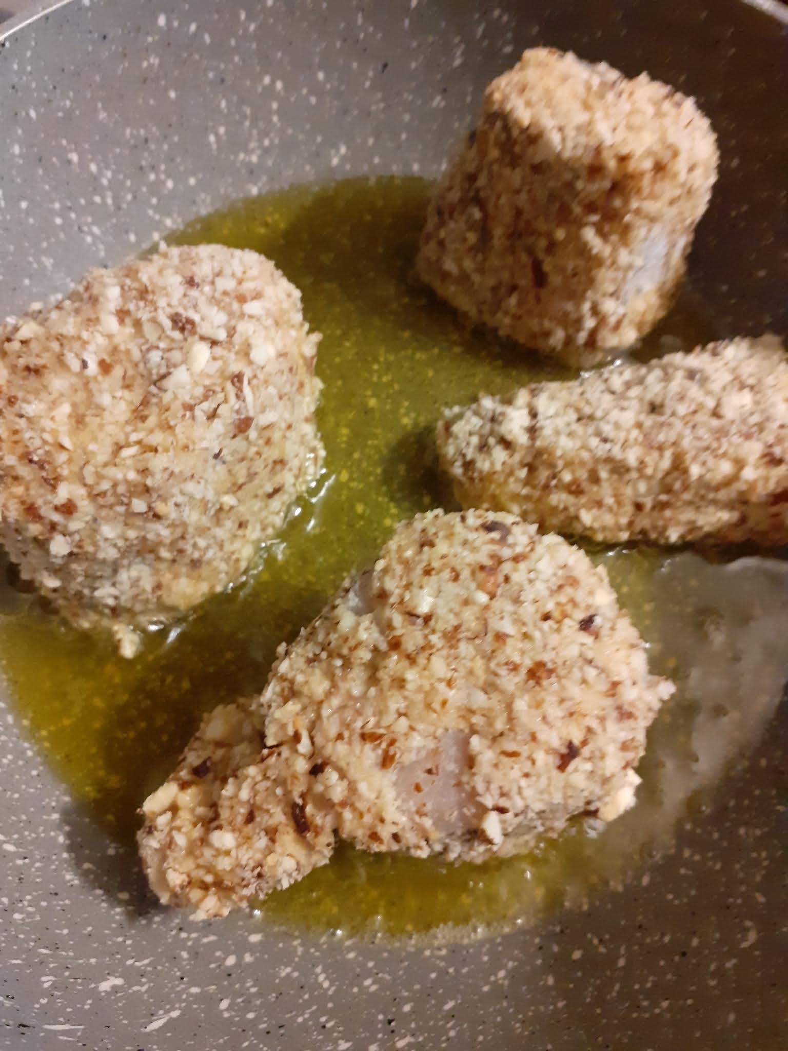 Asciugare i pezzi di merluzzo,passarli nella farina e nelle uova sbattute con sale e pepe,ripassarle poi nel trito di nocciole(facendolo aderire) ed infine friggerli bene in olio caldo da tutti i lati.Intanto preparare il sugo mettendo poco olio e cipolla ad imbiondire,sfumiamo con il vino e uniamo i pelati,poco sale, pepe e olive,lasciamo andare qualche minuto e aggiungiamo il merluzzo panato,copriamo e lasciamo cuocere coperto per 7/8′(stando attente nel caso asciugasse ad aggiungere un filo di acqua).Pronto il tutto.serviamo!!!
