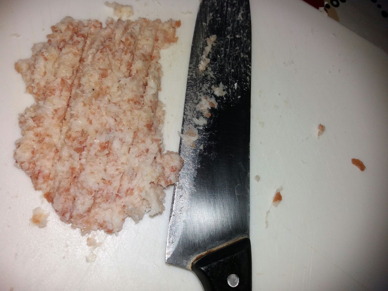 Allacciare il lardo su un tagliere (tritare con un grosso coltello passato sulla fiamma del gas)