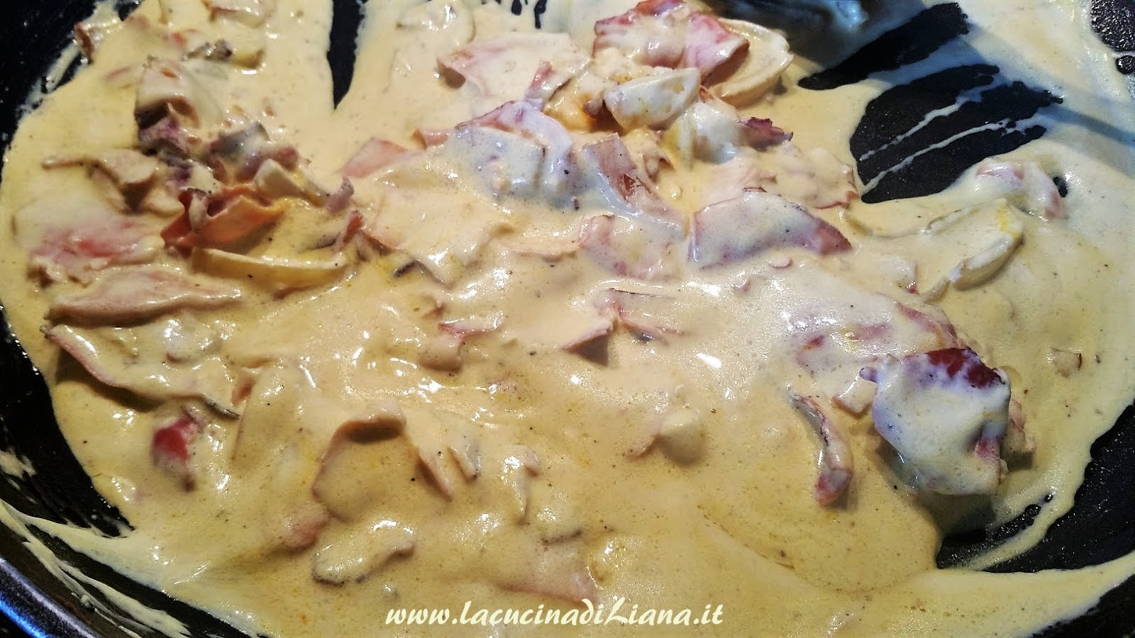 Soffriggere nellolio la cipolla tritata, aggiungere lo speck tagliato a straccetti, dopo 1 minuto aggiungere la panna e scioglierci lo zafferano, se si addensa troppo aggiungere del latte, quindi pepe nero e parmigiano.