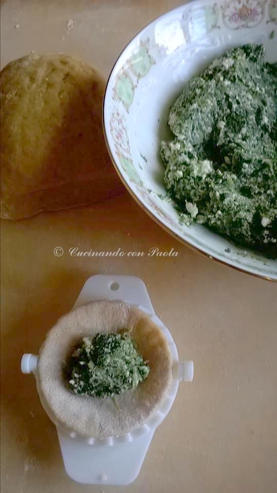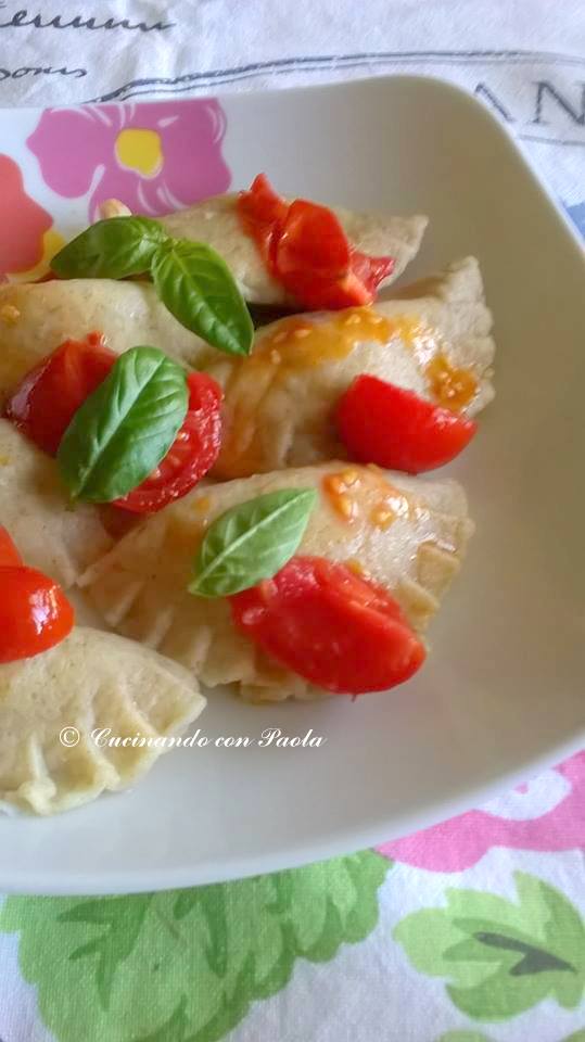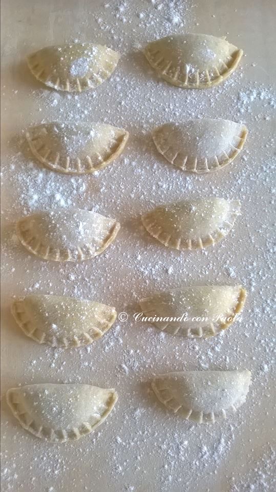Con un coppa pasta ricavate tanti cerchi di circa 5 cm di diametro, distribuendo al centro una piccola noce di ripieno. Richiudiamo il raviolo avendo cura di premere con forza sulla giuntura della pasta e facendo uscire l’aria, per evitare durante la cottura che si rompono. Cuocete le mezzelune in abbondante acqua salata e condite con il classico burro e salvia oppure con un sugo fresco di pachino e basilico. Buon appetito!