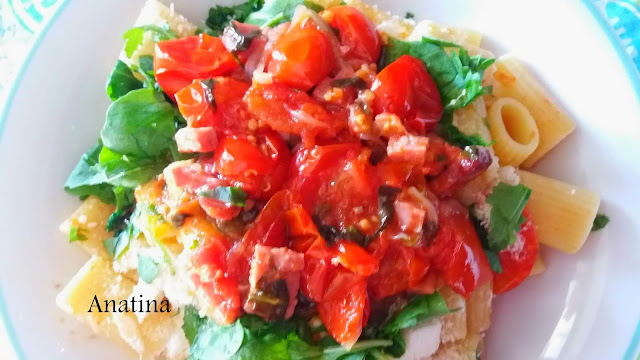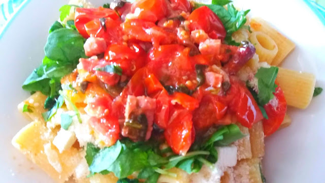 nel fondo del piatto una manciata di rucola,pasta,mozzarella,formaggio,altra rucola e tanto sugo