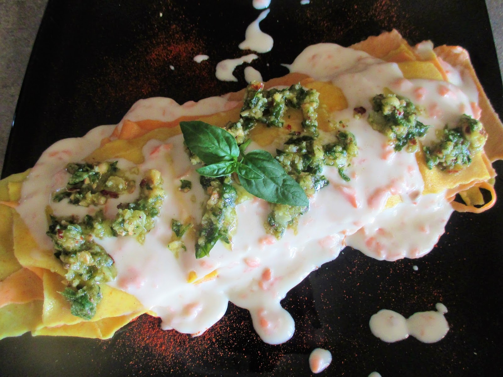 Cuocete la pasta in una pentola di acqua calda. Quando sarà pronta assemblatela con la besciamella alternando una striscia di un colore con una di un altro. Sistemate sulla sommità il pesto di basilico e nocciole quindi servite subito.