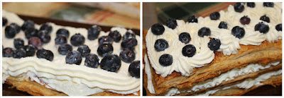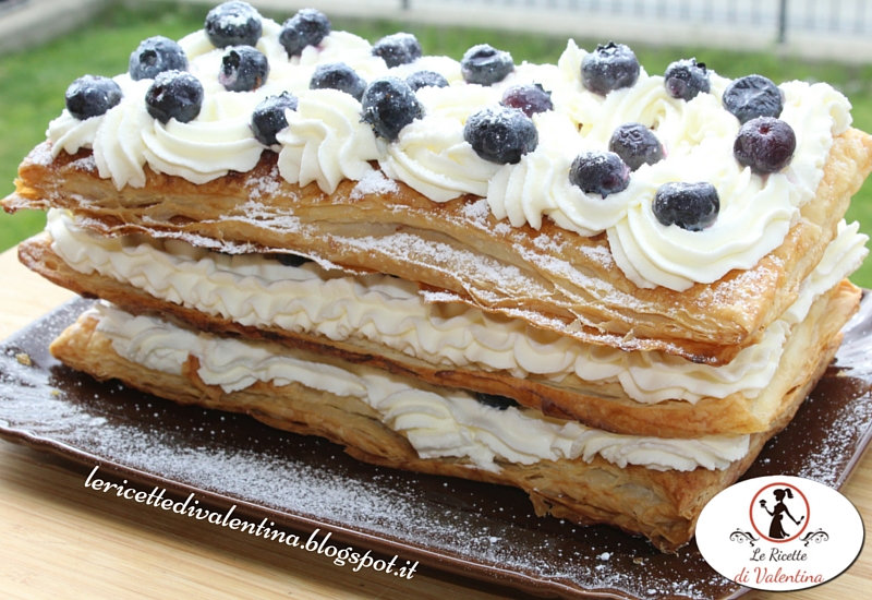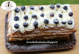 Sistemate 1/3 di mirtilli sulla crema, coprite con il secondo rettangolo di pasta sfoglia e ripetete fino all’esaurimento degli ingredienti. Sulla sommità del dolce potete fare dei disegni più curati con la crema per rendere più carino il dessert, terminate con mirtilli.