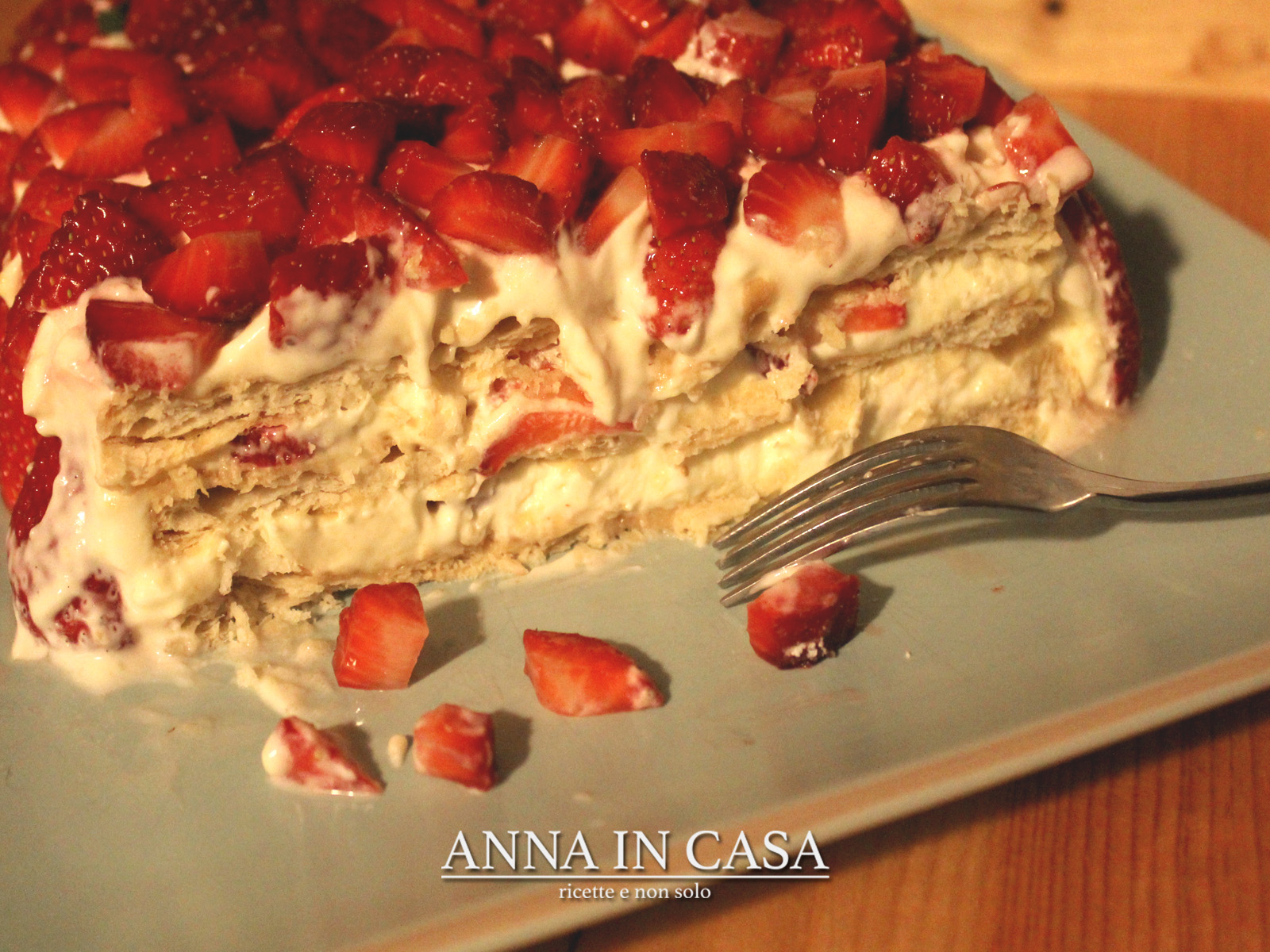 Cospargere la sfoglia con uno strato di crema, formare sopra la crema uno strato di fragole e poi un altro rettangolo di sfoglia, continuando nell’ordine fino all’ultimo strato di sfoglia. Spalmare con l’ultima parte di mascarpone e infine cospargere completamente di fragole.