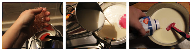 Fate sciogliere il cioccolato a bagnomaria, molti utilizzano il microonde per questa operazione, ma il cioccolato bianco è traditore, brucia in un attimo, quindi mi affido ai metodi tradizionali
